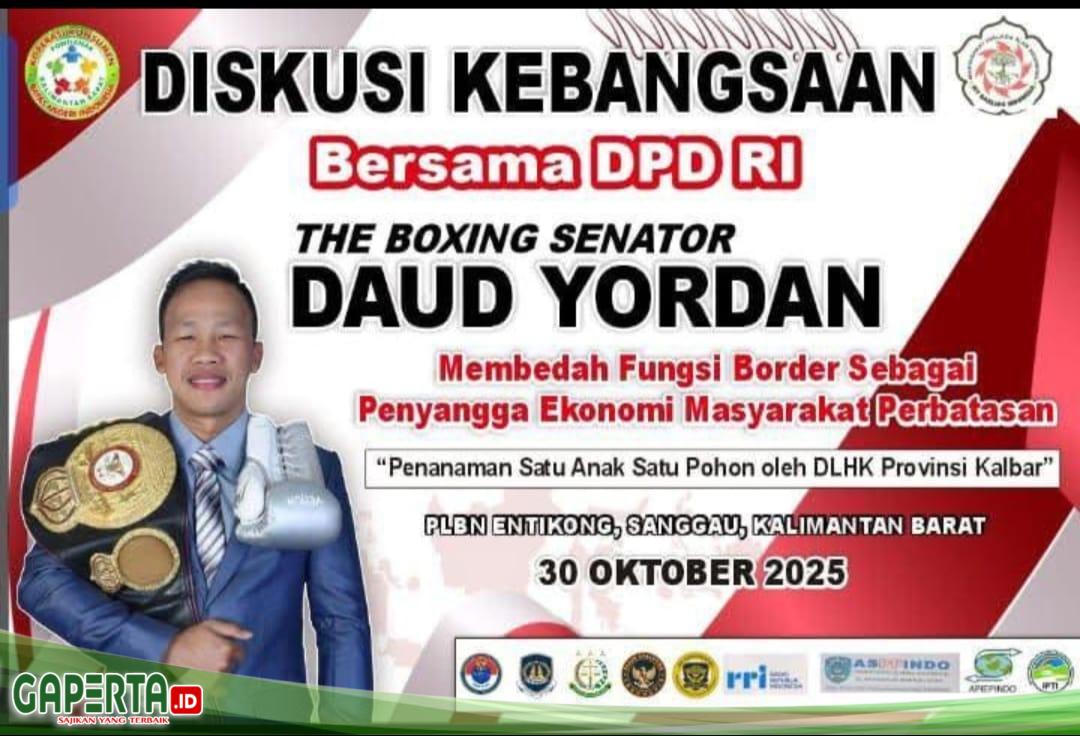 Entikong, [Gaperta.id] – Anggota DPD RI asal Kalimantan Barat, Daud Yordan, atau yang dikenal dengan julukan The Boxing Senator, melakukan kunjungan kerja di kawasan perbatasan Indonesia–Malaysia tepatnya di PLBN Entikong, Kabupaten Sanggau, pada Kamis (30/10/2025).