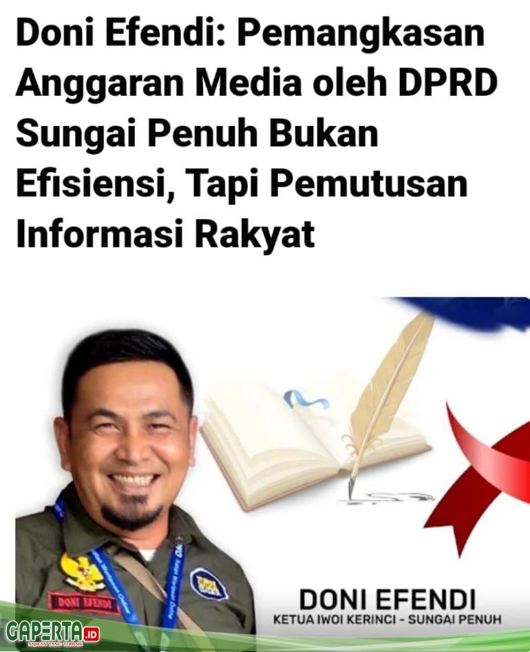 DPT Doni Efendi, Ketua Ikatan Wartawan Online Indonesia Kabupaten Kerinci dan Kota Sungai Penuh, dimintai tanggapannya menyatakan bahwa ia dengar dengar masalah efesiensi, namun ia juga menyesali sikap DPRD Kota Sungai Penuh, sebab efesiensi bukanlah suatu alasan tepat memangkas habis anggaran publikasi media, sebab masyarakat kota Sungai penuh juga butuh informasi kinerja DPRD bagi rakyat.