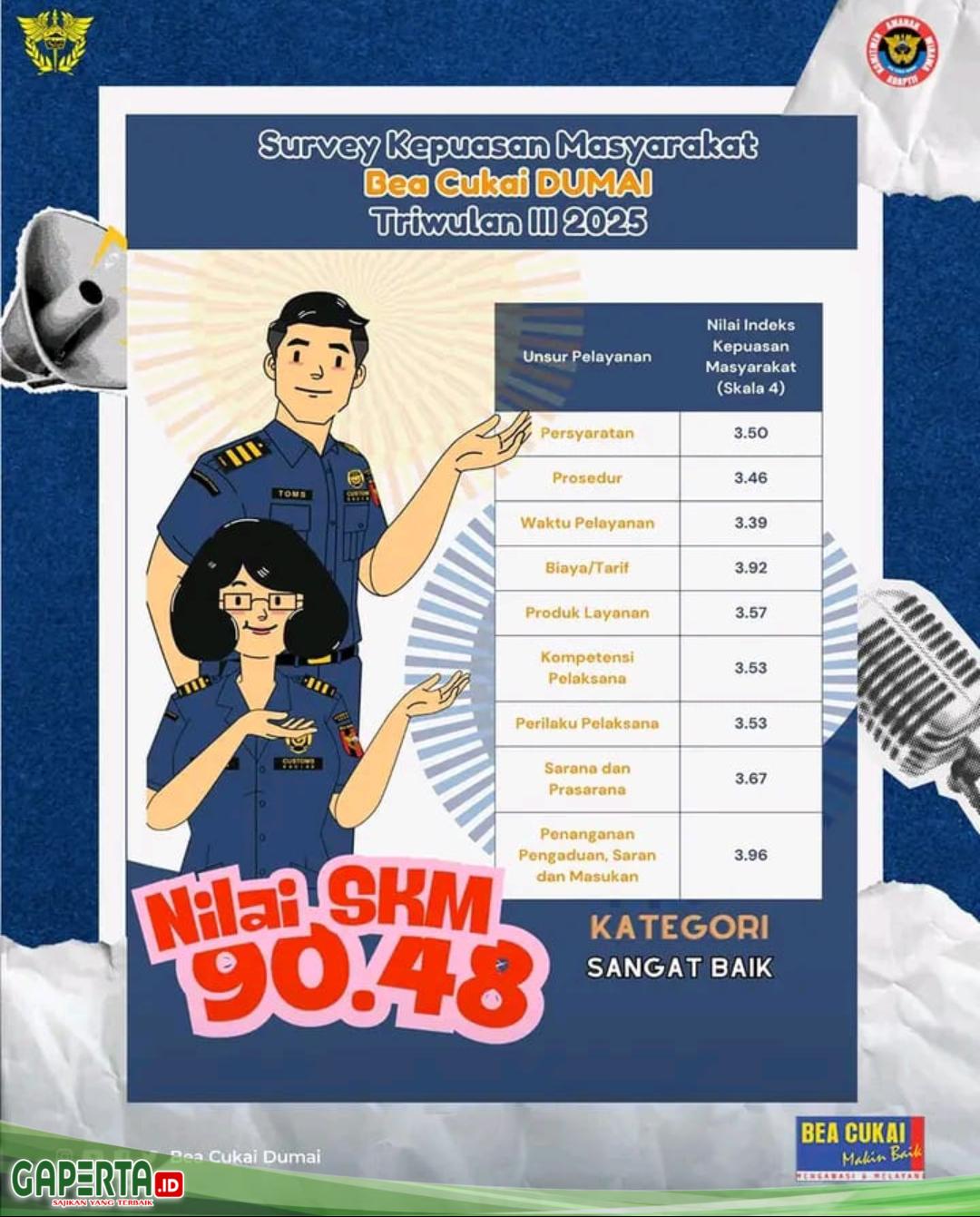 DUMAI, [Gaperta.id] – Bea Cukai Dumai berhasil meraih nilai Survei Kepuasan Masyarakat (SKM) sebesar 90,48 pada triwulan III tahun 2025. Dengan capaian ini, Bea Cukai Dumai memperoleh predikat “Sangat Baik” dalam hal pelayanan publik, Rabu (8/10/2025).
