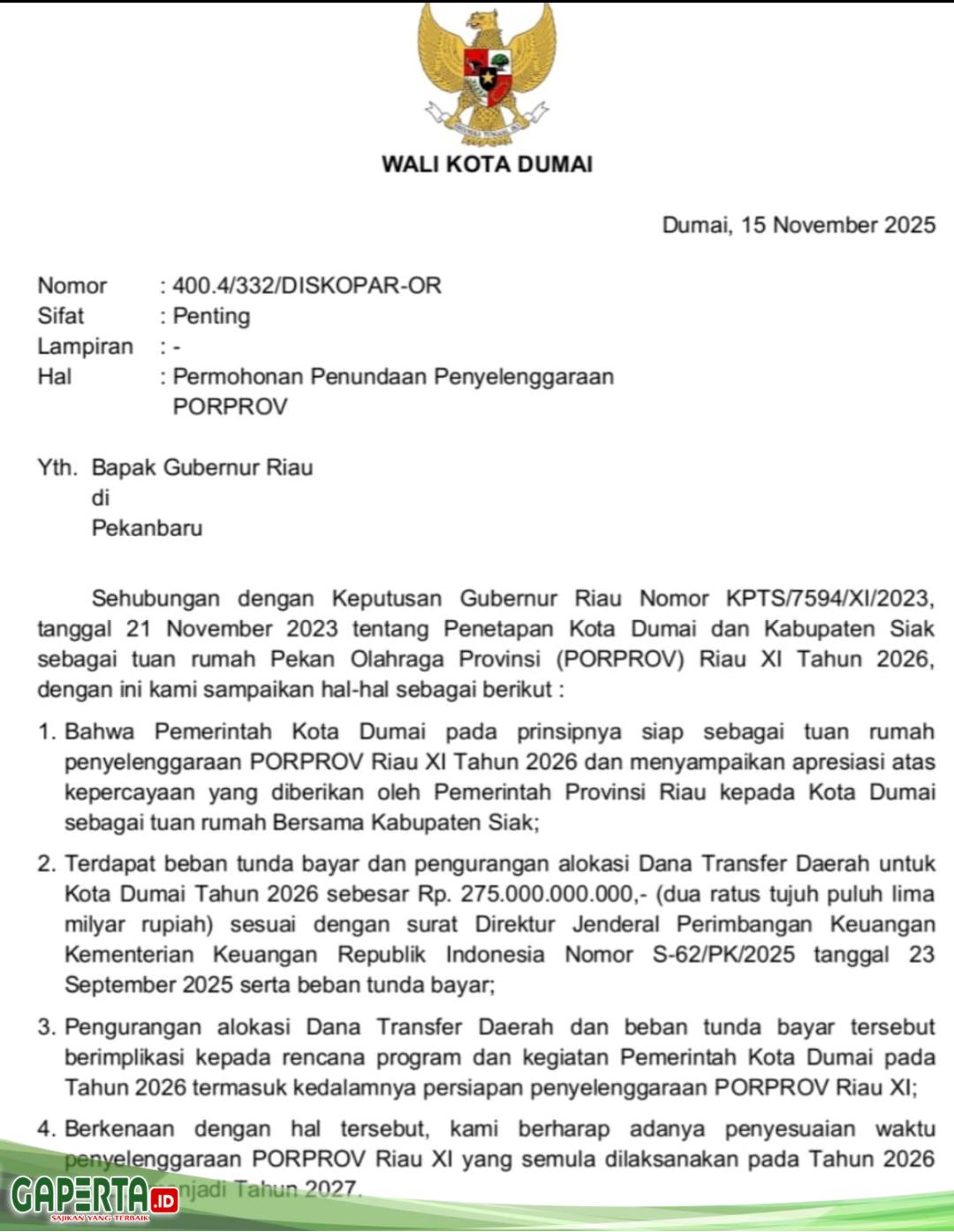 Lewat surat Wali Kota Dumai No.400.4/332/DISKOPAR-OR tanggal 15 November 2025, tentang Permohonan Penundaan Penyelenggaraan Porprov Riau ke-XI Tahun 2026, Wali Kota H Paisal, SKM., MARS., membeberkan alasan permohonan penundaan.