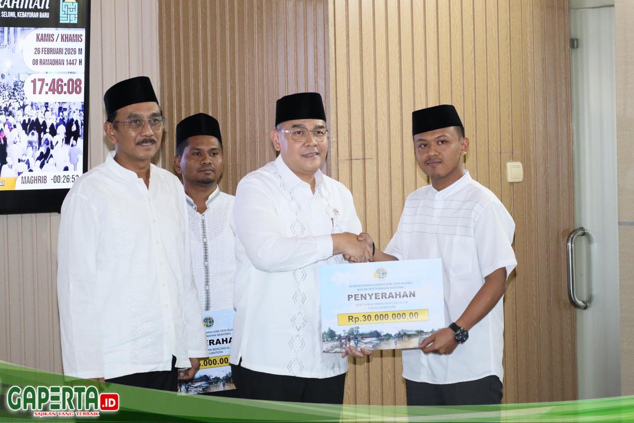 JAKARTA, [Gaperta.id] — Dalam Bulan Suci Ramadan 1447 H, Kementerian Agraria dan Tata Ruang/Badan Pertanahan Nasional (ATR/BPN) menyalurkan bantuan kepada Aparatur Sipil Negara (ASN) asal Aceh yang terdampak bencana hidrometeorologi yang terjadi akhir 2025 lalu. Penyerahan ini dilakukan dalam kegiatan Silaturahmi dan Buka Puasa yang berlangsung di Masjid Nuurur Rahman Kementerian ATR/BPN, Jakarta, Kamis (26/02/2026). Menteri ATR/Kepala BPN, Nusron Wahid, menyampaikan bahwa bantuan yang diberikan merupakan sumbangan bersama dari pegawai Kementerian ATR/BPN.