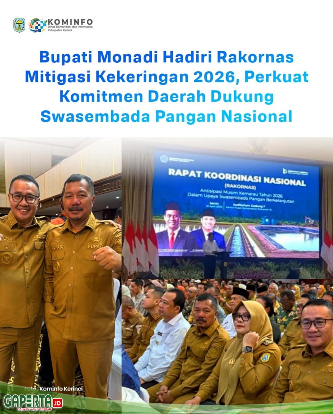 KERINCI, [Gaperta.id] – Pemerintah Kabupaten Kerinci terus mempertegas komitmennya dalam mendukung program ketahanan pangan nasional. Hal tersebut ditunjukkan dengan kehadiran langsung Bupati Kerinci, Monadi, dalam Rapat Koordinasi Nasional (Rakornas) Mitigasi Kekeringan Lahan Pertanian Tahun 2026 yang digelar oleh Kementerian Pertanian Republik Indonesia di Jakarta, Senin (20/4/2026).