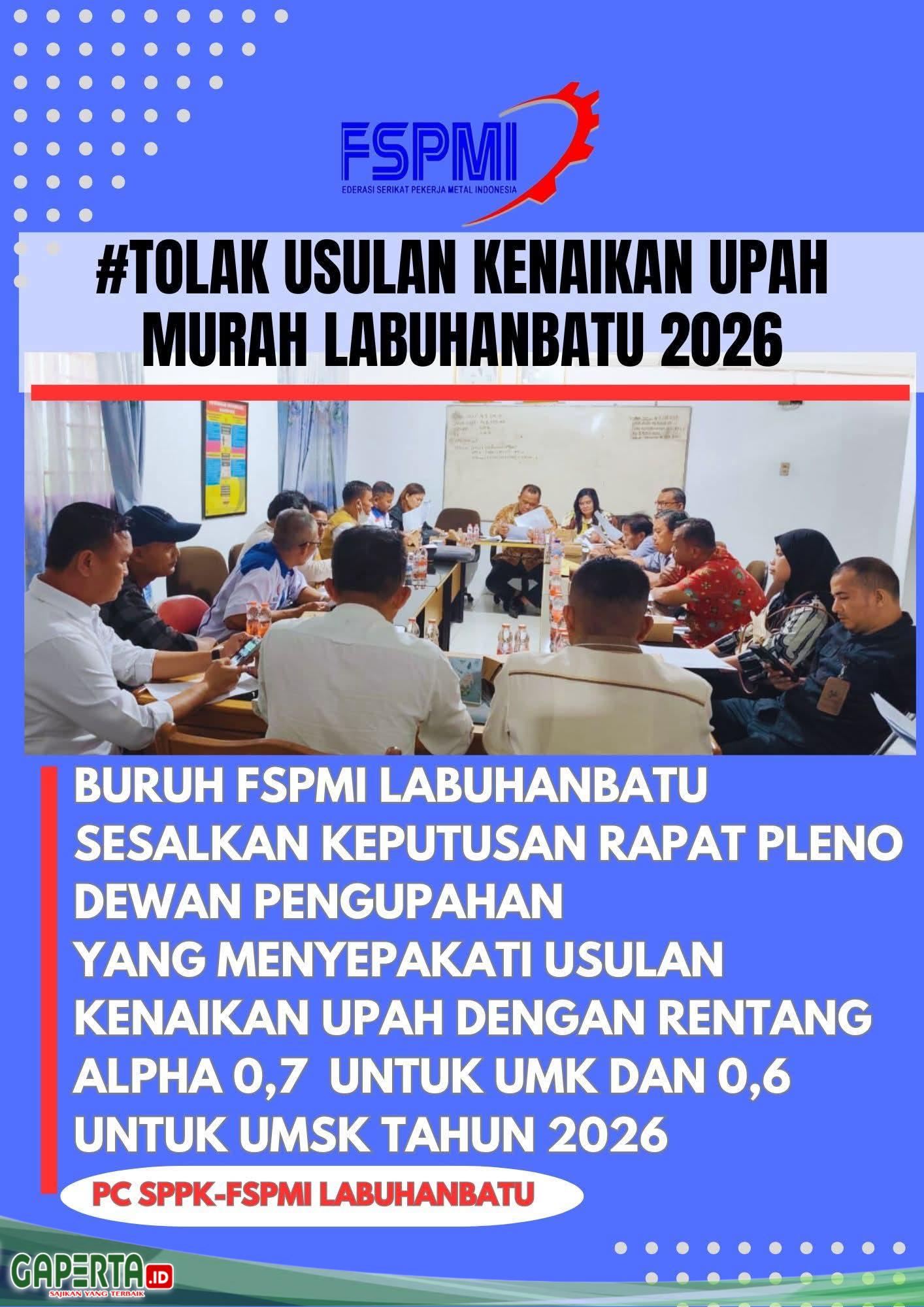 Bahwa sikap kami Buruh yang bekerja di Perusahaan Pabrik Kelapa Sawit dan Perkebunan kelapa Sawit yang ada di Labuhanbatu,dari Unsur Serikat Pekerja FSPMI Labuhanbatu yang menjadi anggota DEPEKAB menolak tegas kenaikan UMK dan UMSK 2026 dengan rentang alpha UMK 0,7 dan UMSK 0,6