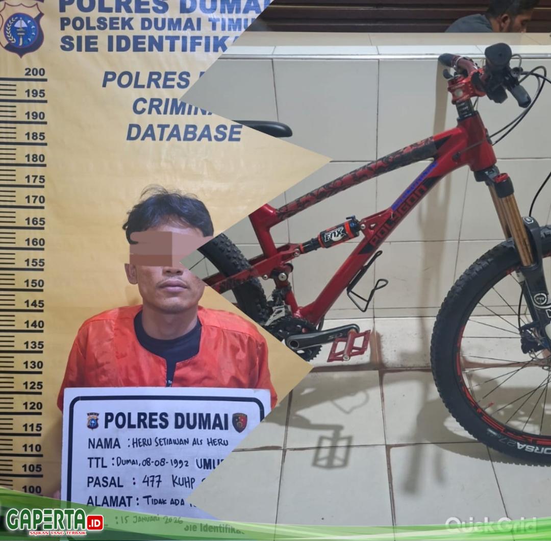 DUMAI, [Gaperta.id] — Polsek Dumai Timur berhasil mengungkap kasus pencurian sepeda yang terjadi di Kelurahan Bukit Batrem, Kecamatan Dumai Timur. Tersangka yang diamankan adalah HS (33), yang mengaku mengambil sepeda merk Polygon D5 Sikiu warna merah milik korban tanpa izin.