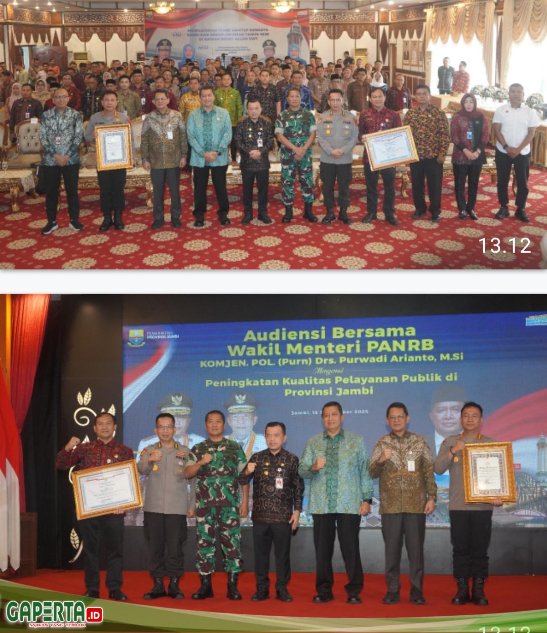 Jambi, [Gaperta.id] – Komitmen untuk meningkatkan kualitas pelayanan publik di Provinsi Jambi semakin ditegaskan melalui kegiatan audiensi bersama Wakil Menteri Pendayagunaan Aparatur Negara dan Reformasi Birokrasi (PANRB), Komjen Pol (Purn) Purwadi Arianto, M.Si, bertempat di Auditorium Rumah Dinas Gubernur Jambi, Rabu (18/9/2025).