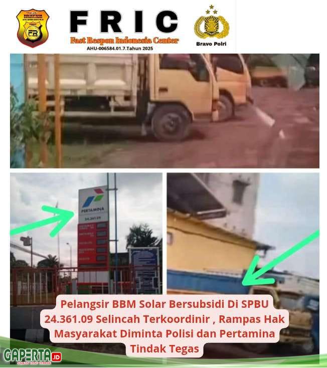 Kota Jambi, [Gaperta.id] – Fast Respon Indonesia Center Provinsi Jambi mendapatkan laporan adanya dugaan Pelangsir BBM Solar bersubsidi yang terkoordinir di SPBU 24.361.09 Selincah Kota Jambi. (10/03/2026)