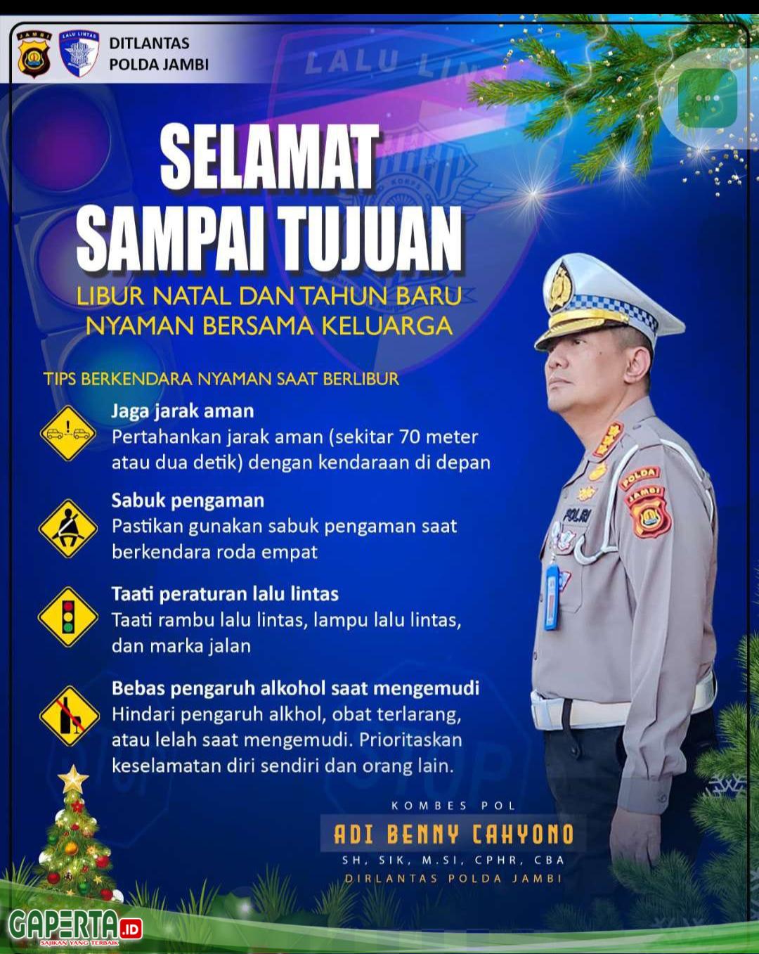 Jambi, [Gaperta.id] – Direktur Lalu Lintas Polda Jambi Kombes Pol Adi Benny Cahyono SH,SIK, MSi, CPHR , CBA memberikan tips aman berkendara selama mudik Natal 2025 dan Tahun Baru 2026