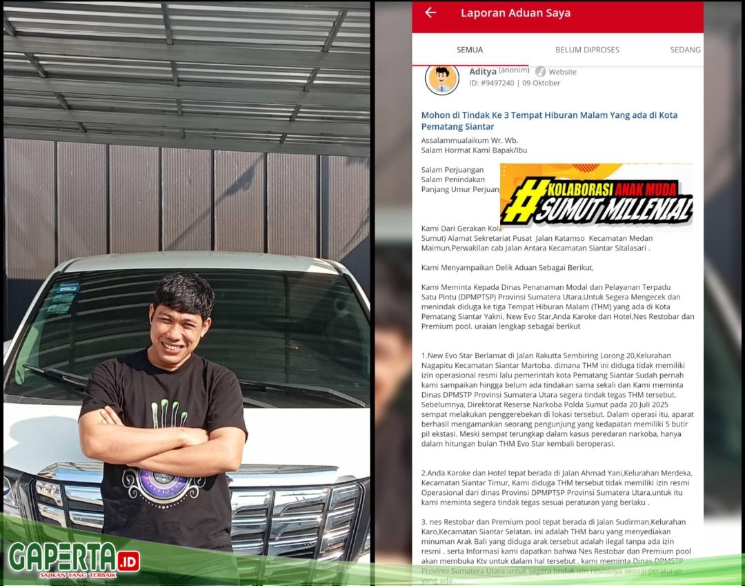 SIANTAR, [Gaperta.id] – Kolaborasi Anak Muda Sumut Millenial resmi melaporkan tiga (3) Tempat Hiburan Malam (THM), di Kota Pematang Siantar, Kamis (9/10/2025). Laporan terkait adanya dugaan transaksi penjualan miras Arak Bali Ilegal atau tanpa izin di tiga THM tersebut.