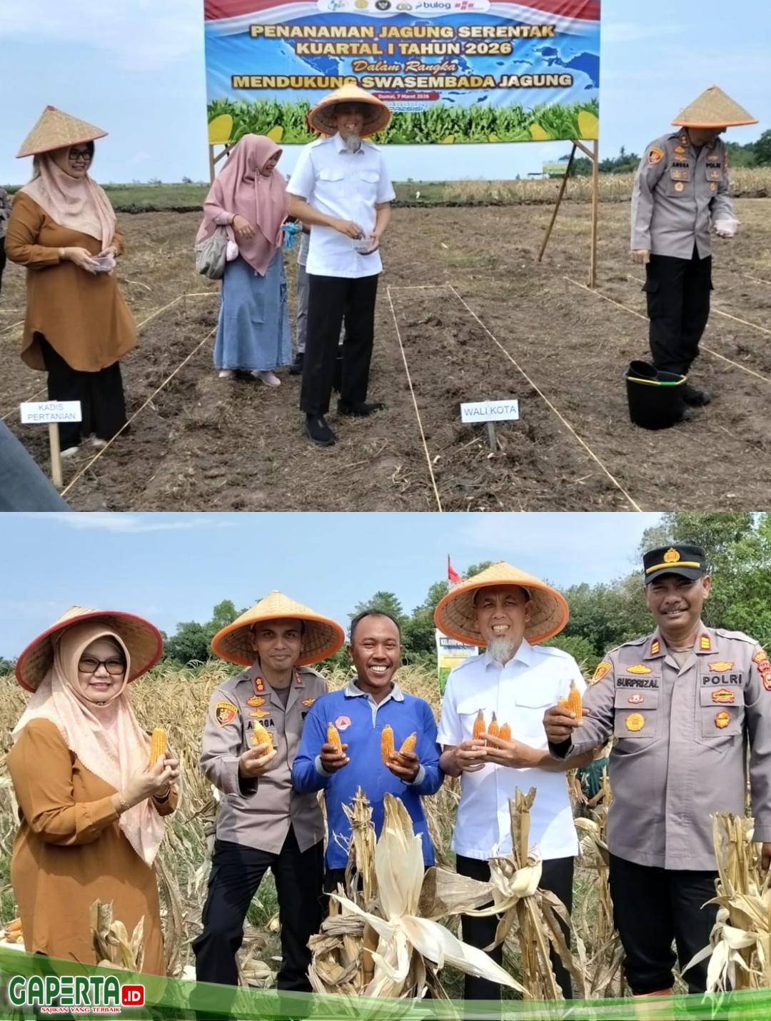 DUMAI, [Gaperta.id] — Kapolres Dumai AKBP Angga Febrian Herlambang bersama Kapolsek Medang Kampai AKP Suprizal beserta jajaran lakukan penen perdana sekaligus penanaman lanjutan bibit jagung pipih secara simbolis di lahan pertanian Kelurahan Mundam Kec. Medang Kampai, Sabtu (7/3/2026).