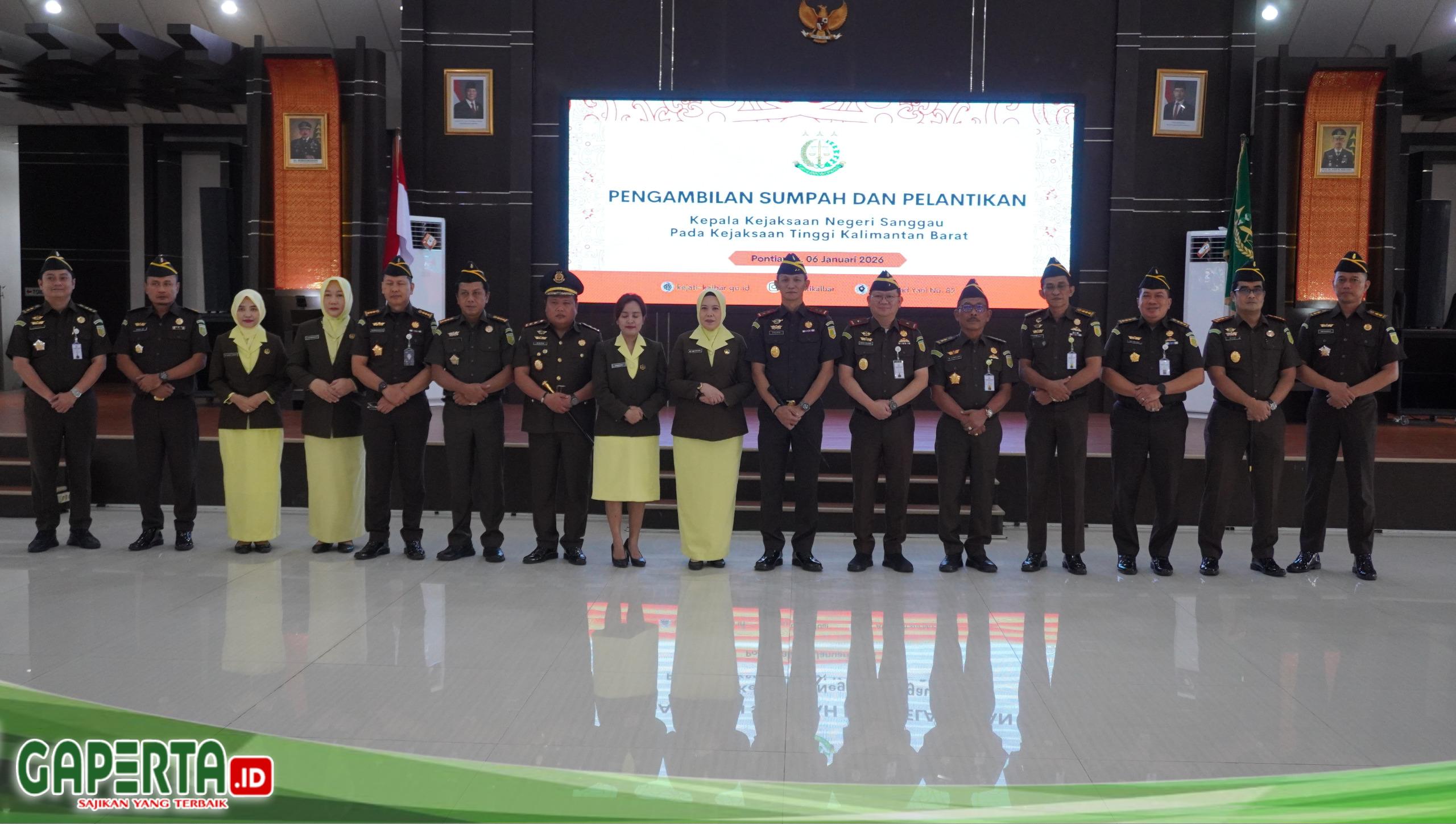 Pontianak, [Gaperta.id] – Kepala Kejaksaan Tinggi Kalimantan Barat Dr. Emilwan Ridwan, secara resmi mengambil sumpah dan melantik Kepala Kejaksaan Negeri Sanggau Eben Ezer Mangunsong, SH.MH dalam sebuah upacara yang berlangsung khidmat di lingkungan Kejaksaan Tinggi Kalimantan Barat, pada Selasa (06/01/2026) brrtempat di Aula Baharudin Lopa Lt. 4 Kejati Kalbar. Prosesi pelantikan tersebut dihadiri oleh Wakajati, Para Asisten, KTU, Koordinator, Kajari dan Kacabjari dan para Kasi Kejari Sanggau dan jajaran, serta tamu undangan lainnya.