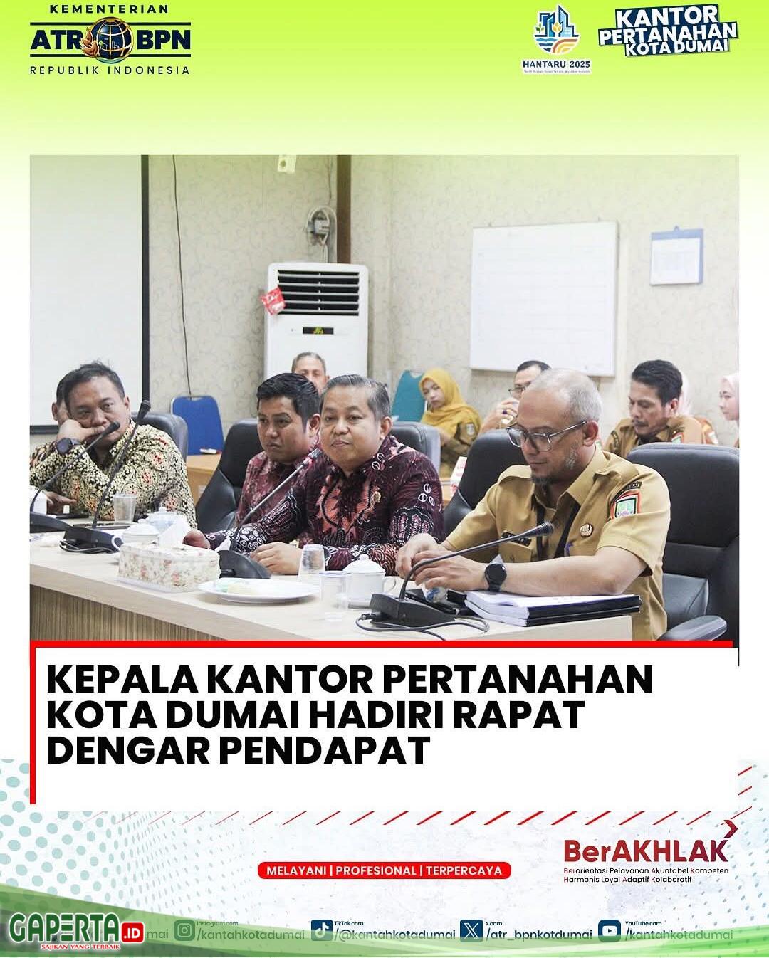 DUMAI, [Gaperta.id] — Kepala Kantor Pertanahan (Kakantah) Kota Dumai, Bapak Adi Irawan, S.SIT., M.H, didampingi Kepala Seksi Survei dan Pemetaan, Bapak Arief Widiansyah, S.T. dan Kepala Seksi Pengendalian dan Penanganan Sengketa, Bapak Ruskandi, S.ST, menghadiri Rapat Dengar Pendapat yang dilaksanakan di Ruang Rapat Cempaka Lantai 1, Gedung DPRD Kota Dumai.