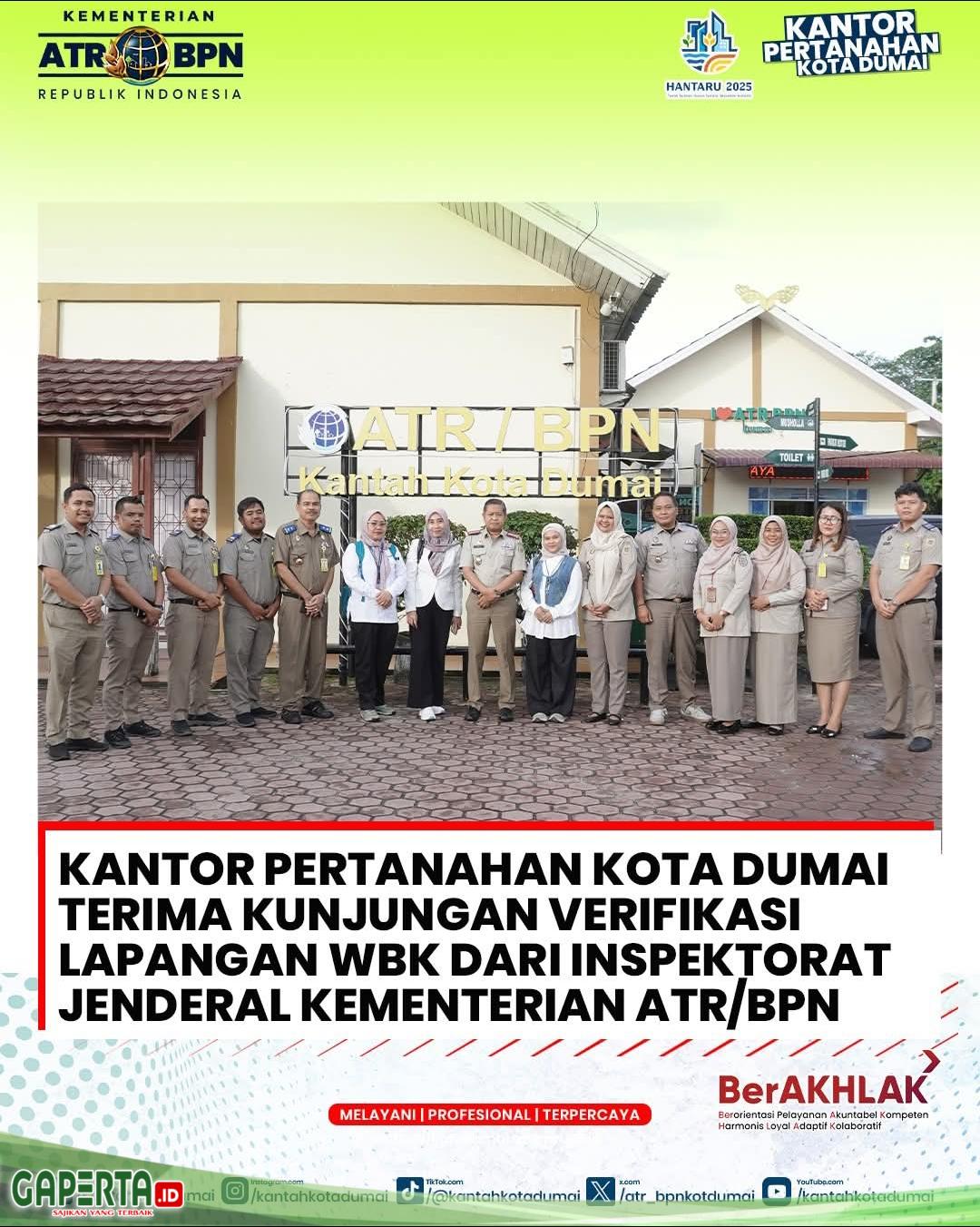 DUMAI, [Gaperta.id] — Dalam rangka penilaian menuju predikat Wilayah Bebas dari Korupsi (WBK), Inspektorat Jenderal Kementerian Agraria dan Tata Ruang/Badan Pertanahan Nasional (ATR/BPN) melaksanakan kegiatan Verifikasi Lapangan ke Kantor Pertanahan Kota Dumai, pada Selasa, 14 Oktober 2025.