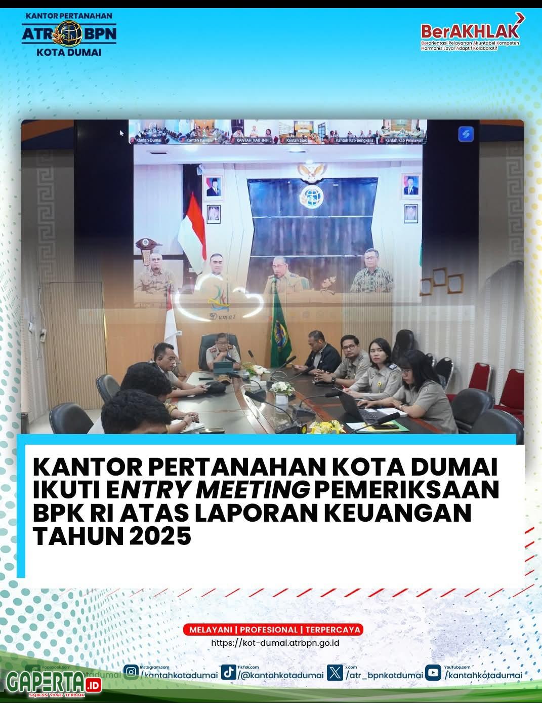 Entry Meeting ini merupakan tahap awal pemeriksaan laporan keuangan tahunan yang bertujuan untuk menyamakan persepsi dan langkah-langkah audit antara BPK RI dengan satuan kerja Kementerian ATR/BPN. Keikutsertaan Kantor Pertanahan Kota Dumai menunjukkan komitmen penuh dalam mendukung transparansi dan akuntabilitas pengelolaan keuangan negara.