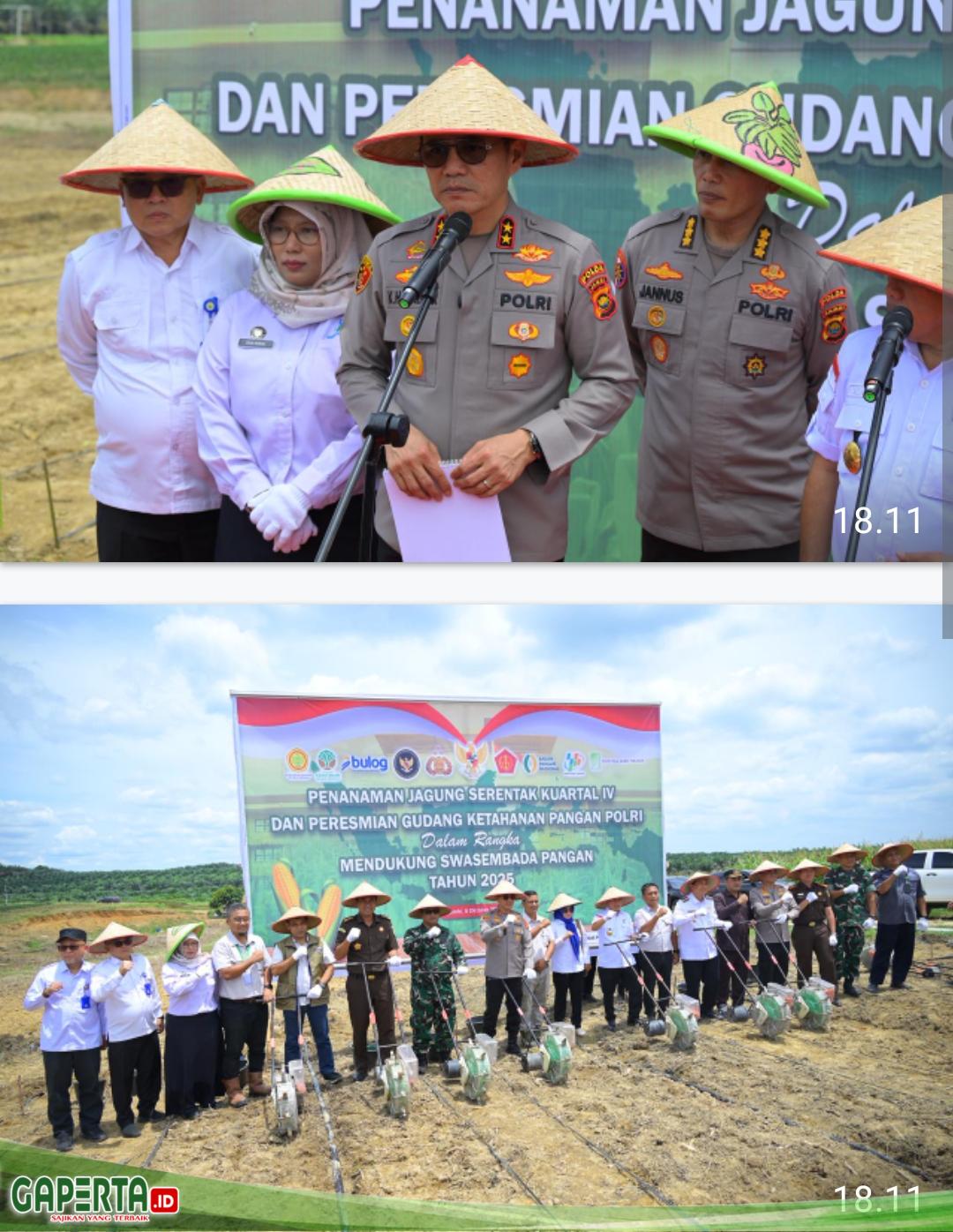 Jambi, [Gaperta.id] – Dalam rangka mendukung program Swasembada Pangan Nasional Tahun 2025, Kepolisian Daerah Jambi melaksanakan kegiatan Penanaman Jagung Serentak Kuartal IV dan Peresmian Gudang Ketahanan Pangan Polri, bertempat di lahan penanaman PT. Brahma Bina Bakti KM. 53, Desa Suko Awin Jaya, Kecamatan Sekernan, Kabupaten Muaro Jambi, Rabu (8/10/2025).