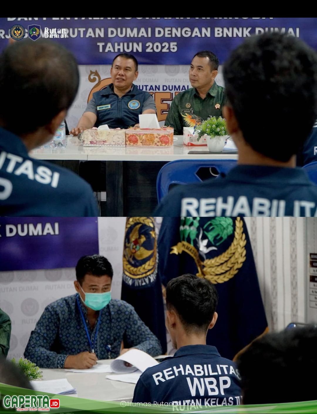 DUMAI, [Gaperta.id] – Kepala Rumah Tahanan Negara (Rutan) Kelas IIB Dumai, Enang Iskandi bersama Kepala Badan Narkotika Nasional Kota (BNNK) Dumai, Sasli Rais, melakukan pemantauan langsung terhadap proses asesmen rehabilitasi bagi warga binaan yang terlibat dalam kasus penyalahgunaan narkotika, Jumat (24/10).