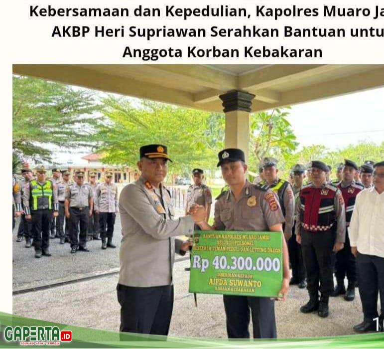 Muaro Jambi, [Gaperta.id] – Nilai kebersamaan dan rasa kekeluargaan kembali ditunjukkan keluarga besar Polres Muaro Jambi. Kapolres Muaro Jambi, AKBP Heri Supriawan, S.I.K. M. H., menyerahkan langsung bantuan kepada salah satu anggota Satuan Keuangan (Sikeu) Polres Muaro Jambi yang tertimpa musibah kebakaran rumah, Senin (09/02/2026).