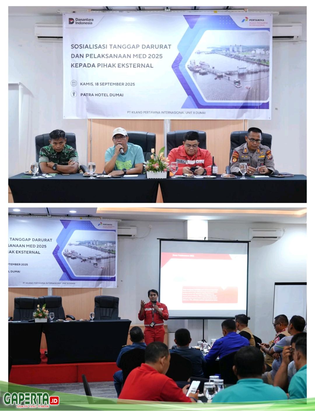 DUMAI, [Gaperta.id] – PT Kilang Pertamina Internasional (PT KPI) Refinery Unit II Dumai atau Kilang Pertamina Dumai menggelar Sosialisasi Tanggap Darurat dan Pelaksanaan Major Emergency Drill (MED) Level II  atau  simulasi latihan penanggulangan keadaan darurat  bersama pihak eksternal perusahaan di Hotel Patra Dumai, Kamis (18/9).