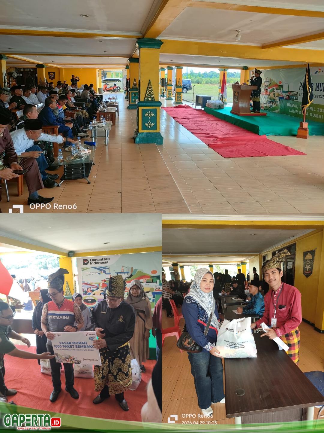 Seremoni pembagian paket sembako berlangsung di gedung LAMR-Dumai, Jl. Putri Tujuh Kelurahan Teluk Binjai, Rabu (29/4/2026) di hadiri Ketua Umum DPH (Dewan Pimpinan Harian) LAMR Dumai Datuk Seri Drs. Zamhur Egab, MM., GM PPN RU II Dumai Iwan Kurniawan, Ketua Umum MKA (Majelis Kerapatan Adat) LAMR Dumai Datuk Azhar Yazid, S.Pdi., Camat dan Lurah, Kepala Dinas, Komandan Grup 3 Kopassus, Kodim 0320/Dumai, Polres Dumai, instansi terkait serta masyarakat penerima manfaat.