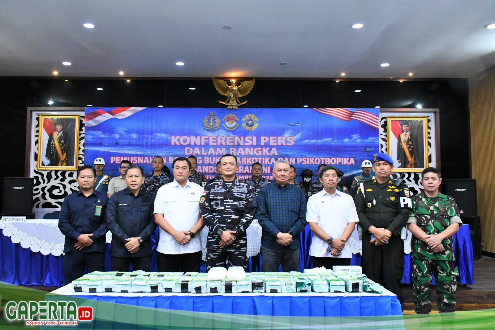 MEDAN, [Gaperta.id] – Komando Daerah Angkatan Laut I memusnahkan barang bukti narkotika jenis ketamine seberat 41,7 kilogram di Gedung Yos Sudarso, Mako Kodaeral I Medan. Kegiatan yang berlangsung pada Sabtu pukul 10.00 WIB tersebut menjadi bukti konsistensi TNI AL dalam menindak penyelundupan narkoba melalui jalur laut serta memperkuat keamanan perairan yurisdiksi nasional.
