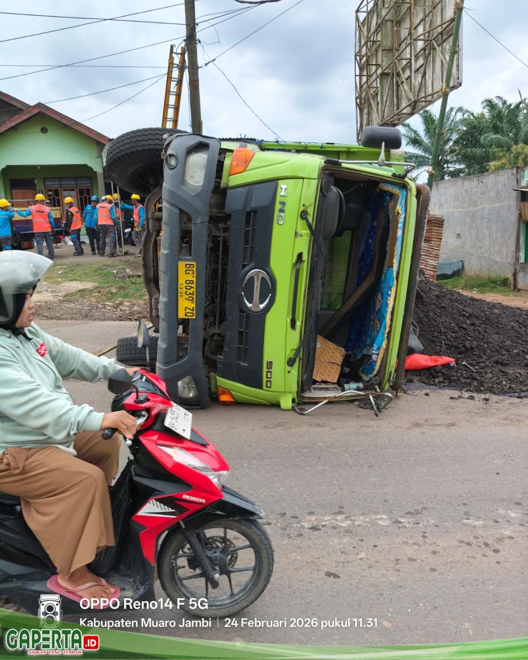 TEMPINO, [Gaperta.id] – Aroma debu hitam dan keresahan kembali menyelimuti warga RT. 10, Tempino. Pada Selasa dini hari (24/02/2026) sekitar pukul 03.00 WIB, sebuah kecelakaan tunggal kembali terjadi. Satu unit truk Fuso Hino dengan nomor polisi (BG 8639 ZQ) yang mengangkut batu bara terjungkal tepat di depan SPBU Tempino, KM 27.