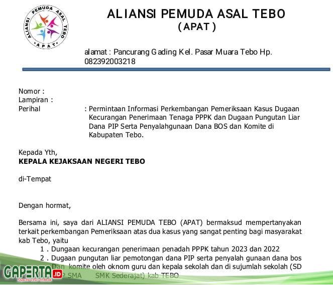 Tebo, [Gaperta.id] – Di tengah hiruk-pikuk rutinitas pendidikan dan birokrasi, sebuah surat resmi diam-diam meluncur ke meja pimpinan Kejaksaan Negeri Tebo. Surat itu bukan dari pejabat, bukan pula dari wakil rakyat. Pengirimnya: sekelompok anak muda yang menamakan diri mereka Aliansi Pemuda Asal Tebo (APAT).