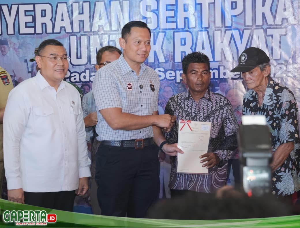PADANG, [Gaperta.id] — Kementerian Agraria dan Tata Ruang/Badan Pertanahan Nasional (ATR/BPN) melakukan penghormatan kepada tanah ulayat di Indonesia melalui sertipikasi tanah ulayat/tanah masyarakat hukum adat. Hal ini disampaikan oleh Wakil Menteri (Wamen) ATR/Wakil Kepala (Waka) BPN, Ossy Dermawan, pada kegiatan Penyerahan Sertipikat Tanah untuk Rakyat, di Kerapatan Adat Nagari (KAN) Kuranji, Kota Padang, Selasa (30/09/2025).