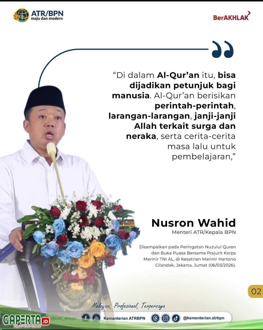 JAKARTA, [Gaperta.id] – Menteri Agraria dan Tata Ruang/Badan Pertanahan Nasional (ATR/BPN), Nusron Wahid, menyampaikan ceramah agama pada peringatan Nuzulul Quran dan buka puasa bersama prajurit Korps Marinir TNI Angkatan Laut di Gedung Aminullah Ibrahim, Kesatrian Marinir Hartono Cilandak, Jakarta, Jumat (06/03/2026). Dalam kesempatan tersebut, ia mengingatkan bahwa turunnya Al-Qur’an merupakan rahmat dan nikmat besar bagi umat manusia serta menjadi petunjuk hidup yang berisi perintah, larangan, dan pelajaran bagi umat beriman.