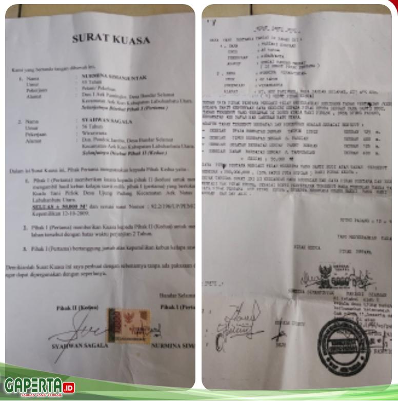 “Saya yang bernama syahwan Sagala, yang tertera di surat kuasa yang di kuasakan oleh nurmina Simanjuntak atas sebidang kebun kelapa sawit, seluas _+ 5000 m2, berdasarkan surat yang dikeluarkan dari oleh kepala desa ujung padang dan di tandangi oleh kepala dusun Kuala tani pirlok,dan saksi saksi yg berbatas dengan lahan tersebut,dan sudah langsung konfirmasi dengan mantan kades ujung padang, dia menyatakan saat itu, bahwa Sanya benar lahan dari saudari Nurmina Simanjuntak dan dikuatkan oleh mantan Kadus dan juga saksi sepadan, itulah maka saya yang menguasi dan mengelola lahan tersebut maka sudah kurang lebih satu tahun sudah saya kuasai dan saya kelola,