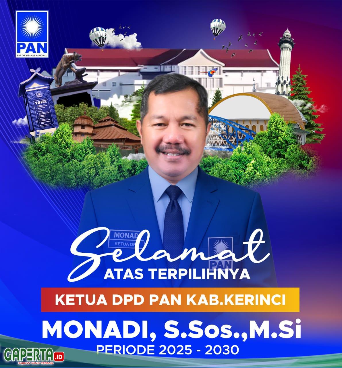 Pasca terpilih sebagai Ketua DPD Partai Amanat Nasional (PAN) Kabupaten Kerinci, Monadi, saat dikonfirmasi, Minggu (15/11/2025), menyampaikan rasa syukur dan terima kasih atas amanah yang telah diberikan oleh Ketua Umum PAN serta seluruh kader PAN di Kerinci. jabatan tersebut bukan sekadar kepercayaan, tetapi juga tanggung jawab besar untuk membawa PAN Kerinci semakin solid, maju dan berdaya saing.