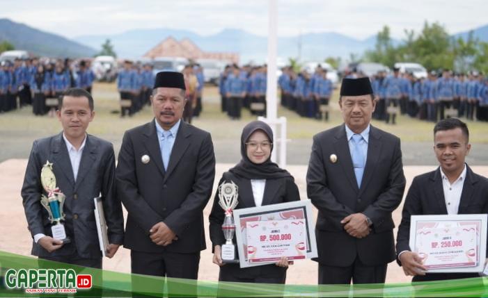Penyerahan penghargaan dilakukan oleh Bupati Kerinci Monadi, S.Sos., M.Si, didampingi Wakil Bupati Kerinci H. Murison, diiringi lagu “Bagimu Negeri” yang menambah suasana haru dan kebanggaan bagi seluruh peserta upacara.