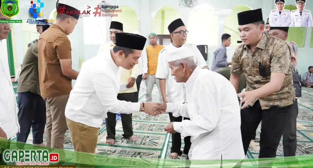 Bupati Padang Lawas Putra Mahkota Alam Hasibuan SE menghadiri acara kegiatan safari Ramadhan tahun 1447 H /2026 M tingkat Kabupaten di Masjid Baiturrahman Pasar Binanga Kecamatan Barumun Tengah, (27/02/26).