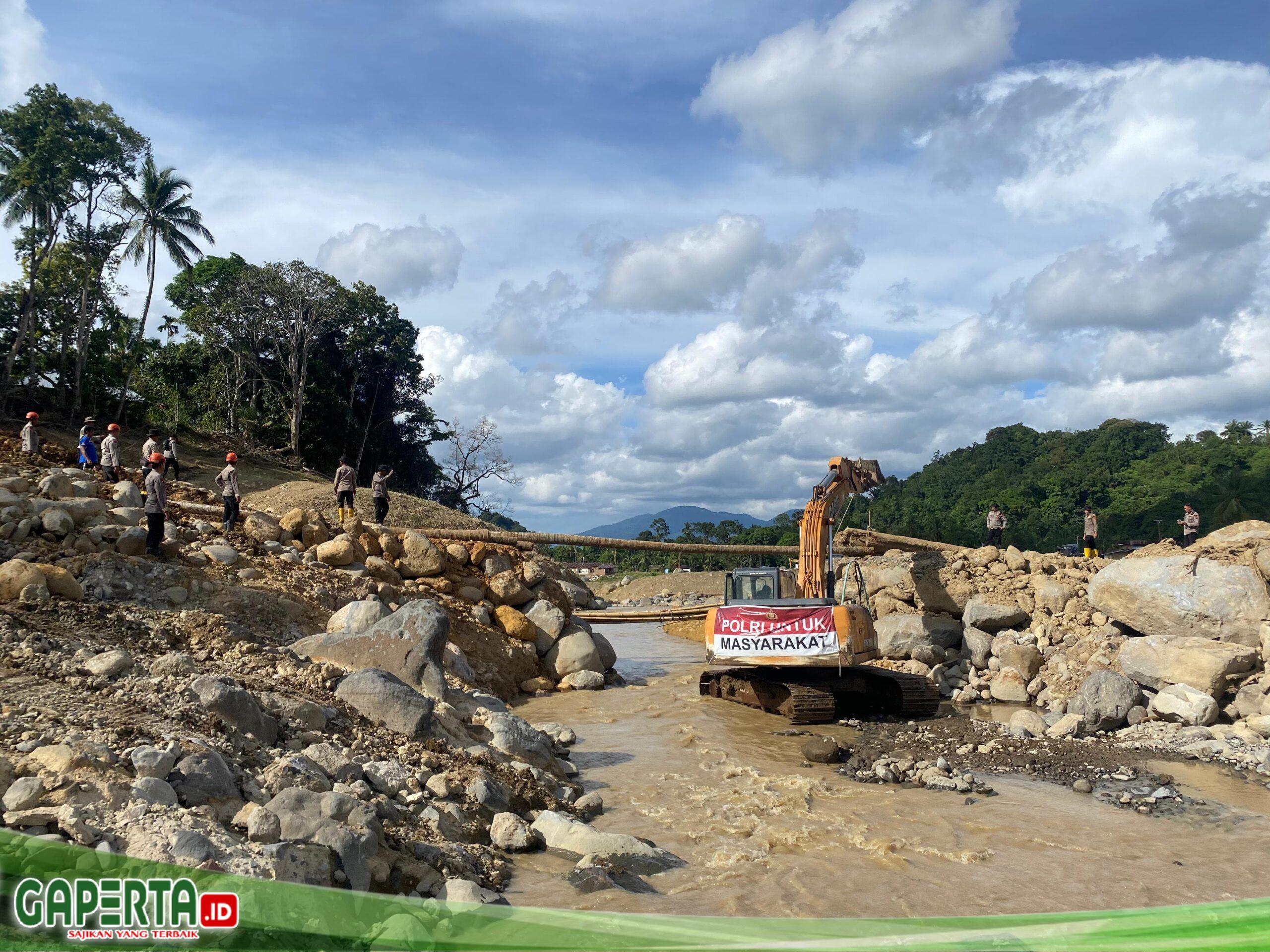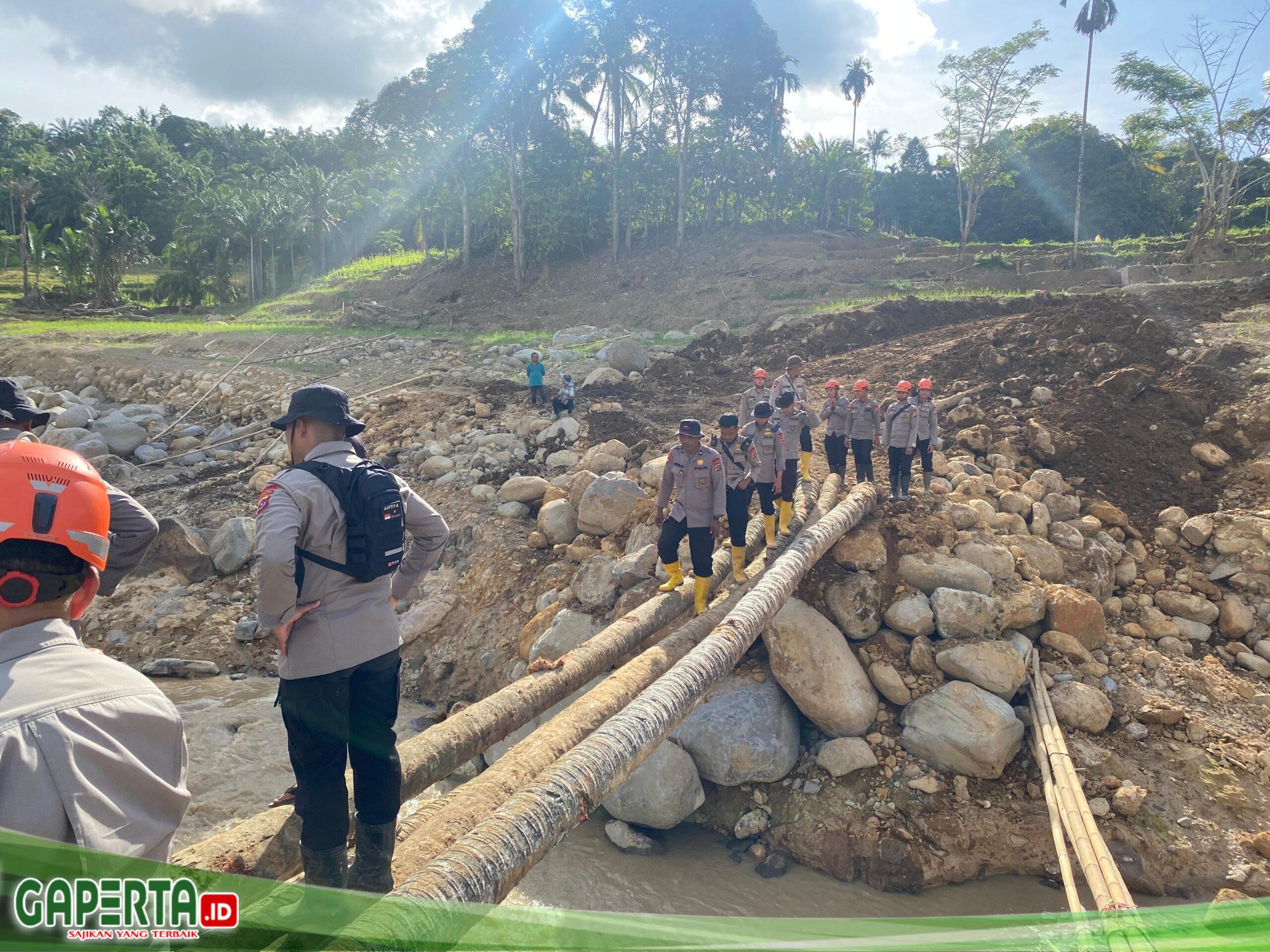 Dalam kegiatan tersebut, personel Brimob bergotong royong mengangkut kayu serta material dasar untuk membangun jembatan darurat. Jembatan ini sangat dibutuhkan masyarakat setempat karena menjadi akses utama penghubung antar desa yang sempat terputus akibat bencana.