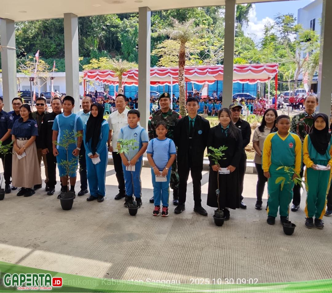 Entikong, [Gaperta.id] – Dalam rangka memperingati Hari Sumpah Pemuda ke-97, Satuan Tugas Pengamanan Perbatasan (Satgas Pamtas) RI–Malaysia Yonarmed Yonarmed Arhanud 1 bersama Dinas Lingkungan Hidup dan Kehutanan (DLHK) Provinsi Kalimantan Barat melaksanakan kegiatan penanaman pohon bertema “Satu Anak Satu Pohon”, di halaman Gedung Serbaguna Wisma Entikong, Kabupaten Sanggau, Rabu (30/10/2025).