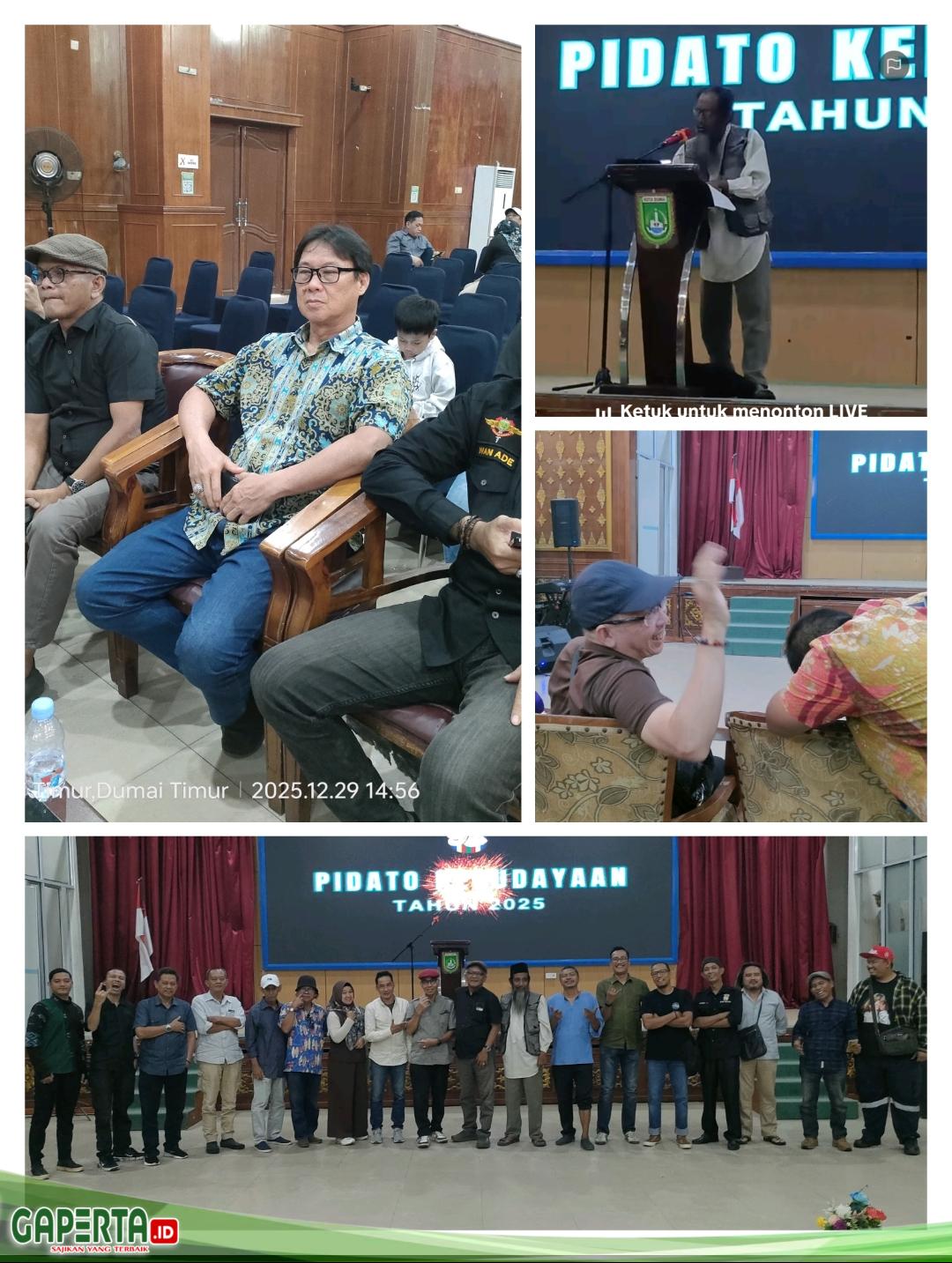 Berlangsung di Pendopo Sri Bunga Tanjung, Pidato Kebudayaan yang diprakarsai Ketua Dewan Kesenian Daerah (DKD) Kota Dumai, Cik Agoes S Alam (Budianto) itu padat diisi penampilan para budayawan puisi yang sudah melegenda di Riau dan Kota Dumai.