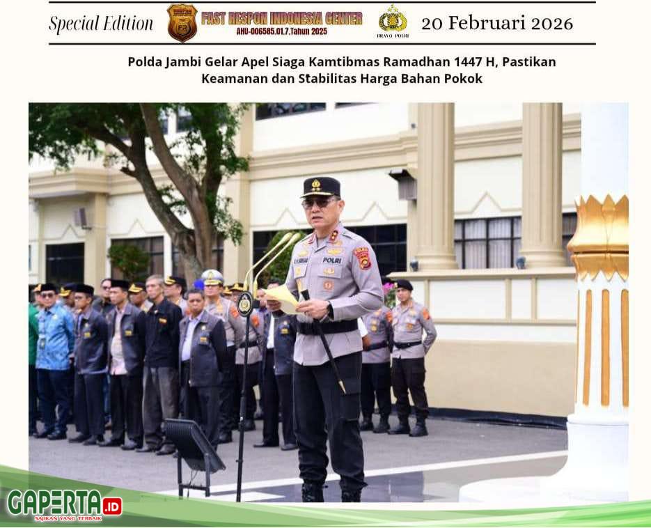 JAMBI, [Gaperta.id] – Dalam rangka menjaga situasi keamanan dan ketertiban masyarakat (Kamtibmas) selama bulan suci Ramadhan 1447 H/2026 M, Polda Jambi menggelar Apel Siaga Kamtibmas Bulan Ramadhan 1447 H/2026 M pada Jumat, (20/02/2026)