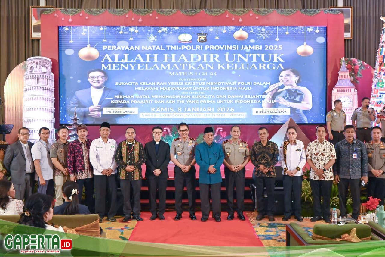 Kapolda Jambi Irjen Pol. Krisno H. Siregar dalam sambutannya mengucapkan selamat Natal Tahun 2025 kepada seluruh personel Polda Jambi dan Korem 042/Gapu yang beragama Kristen dan Katolik.