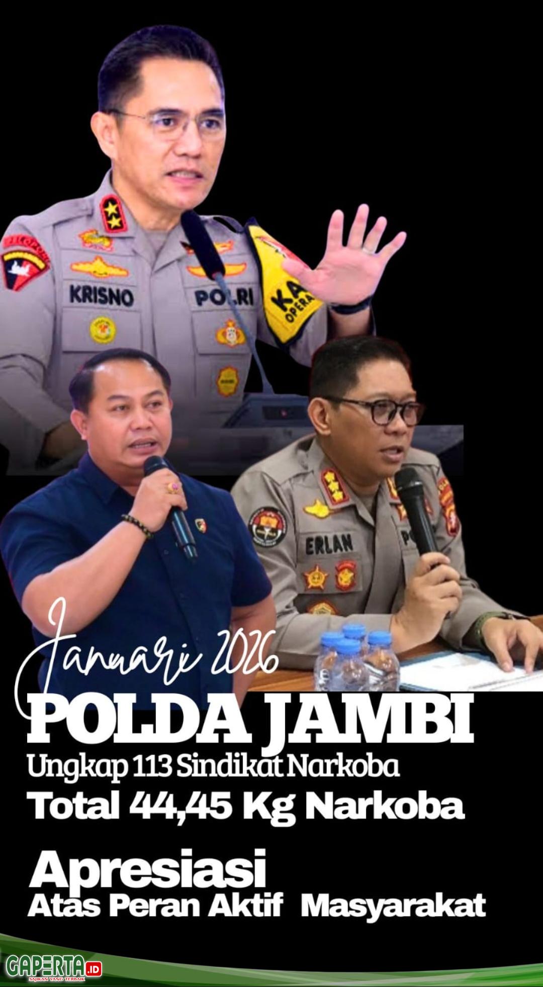 Jambi, [Gaperta.id] – Direktorat Reserse Narkoba Polda Jambi bersama satuan Reserse Narkoba Polres/ta jajaran berhasil mengungkap 113 sindikat narkoba selama periode Januari 2026.
