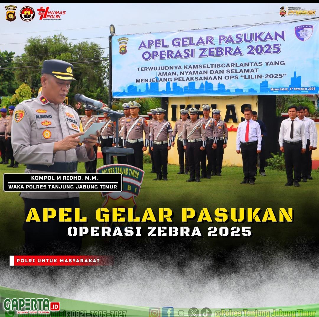 Tanjung Jabung Timur, [Gaperta.id] – Menjelang Operasi Lilin 2025, Polres Tanjung Jabung Timur gelar Operasi Zebra Siginjai 2025 dengan tema “Terwujudnya Kamseltibcarlantas Aman, Nyaman dan Selamat” bertempat di lapangan apel Mako Polres Tanjab Timur, Senin (17/11/2025).