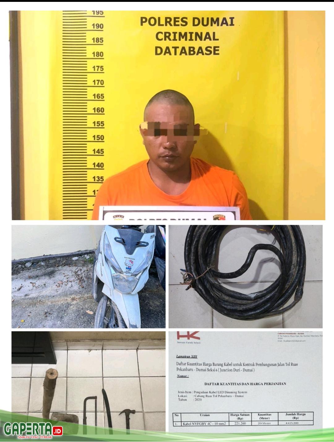 Kasus tersebut bermula pada Sabtu (20/12/2025), sekitar pukul 02.14 WIB, ketika petugas Piket Kamtib Ranting III Tol Permai berhasil mengamankan seorang pria berinisial Al Awi Als Awi Bin FB yang tertangkap tangan saat melakukan pencurian kabel PJU di Jalur B akses keluar Gerbang Tol Dumai. Kabel yang dicuri diketahui merupakan kabel PJU jenis NYFGBY 4C – 10 mm².