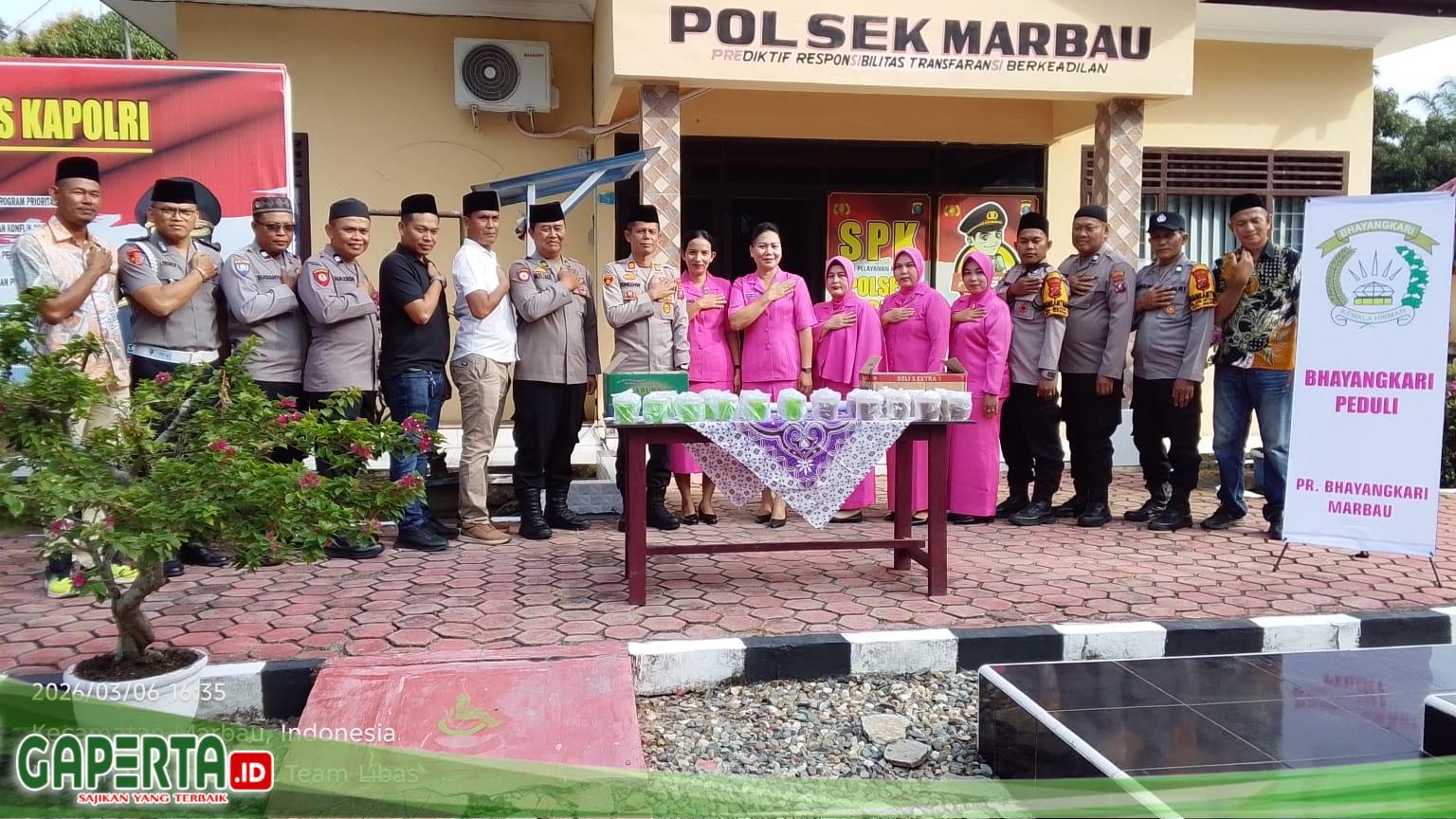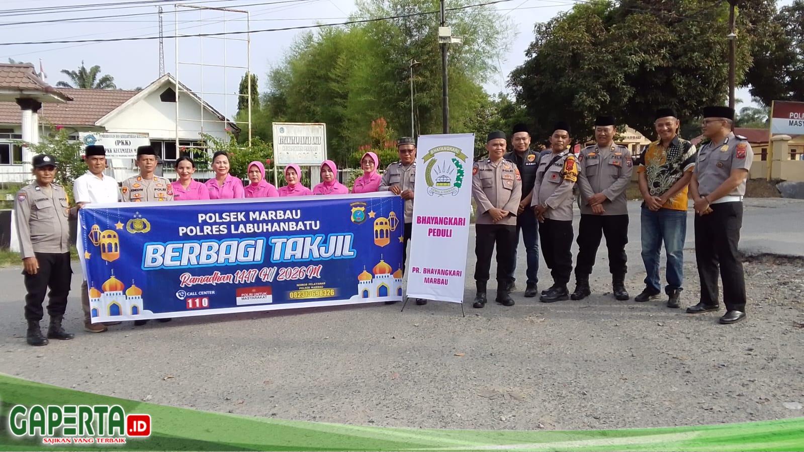 Kegiatan yang berlangsung sekitar pukul 17.00 Wib di Jalan lintas kelurahan marbau, Kecamatan Marbau, Kabupaten labuhanbatu utara tersebut dipimpin langsung oleh Kapolsek Marbau AKP JHONLY HW SH,MH serta diikuti oleh Ketua Ranting Bhayangkari Polsek Marbau bersama anggota Bhayangkari, para Kanit, serta seluruh personel Polsek Marbau.Dengan penuh kehangatan, personel Polsek Marbau bersama Bhayangkari membagikan paket takjil sebanyak 100 paket 50 paket bubur 50 paket es buah kepada para pengendara dan masyarakat yang melintas. Kegiatan ini menjadi salah satu bentuk nyata kepedulian Polri kepada masyarakat, khususnya bagi umat Muslim yang sedang menjalankan ibadah puasa.
