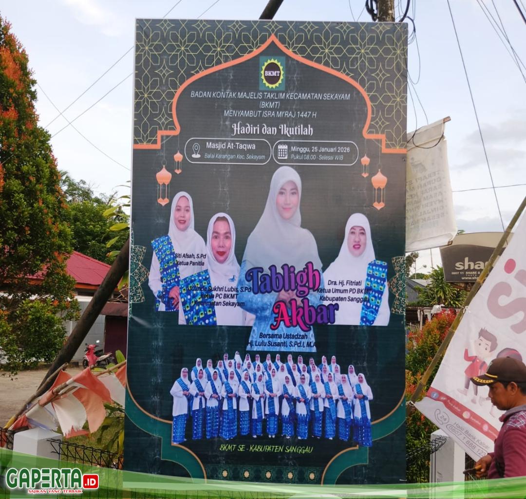 Sekayam, [Gaperta.id] – Badan Kontak Majelis Taklim (BKMT) Kecamatan Sekayam menggelar kegiatan Tabligh Akbar dalam rangka menyambut Isra Mi’raj 1447 Hijriah, Minggu (25/01/2026), yang dipusatkan di Masjid At-Taqwa, Balai Karangan, Kecamatan Sekayam, Kabupaten Sanggau.