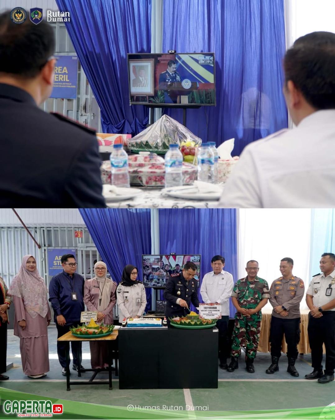 DUMAI, [Gaperta.id] – Rumah Tahanan Negara (Rutan) Kelas IIB Dumai menggelar kegiatan tasyakuran dalam rangka memperingati Hari Bakti Pemasyarakatan (HBP) ke-62, Senin (27/4). Kegiatan berlangsung secara hybrid melalui Zoom Meeting dan diikuti oleh seluruh Unit Pelaksana Teknis (UPT) Pemasyarakatan di Indonesia.