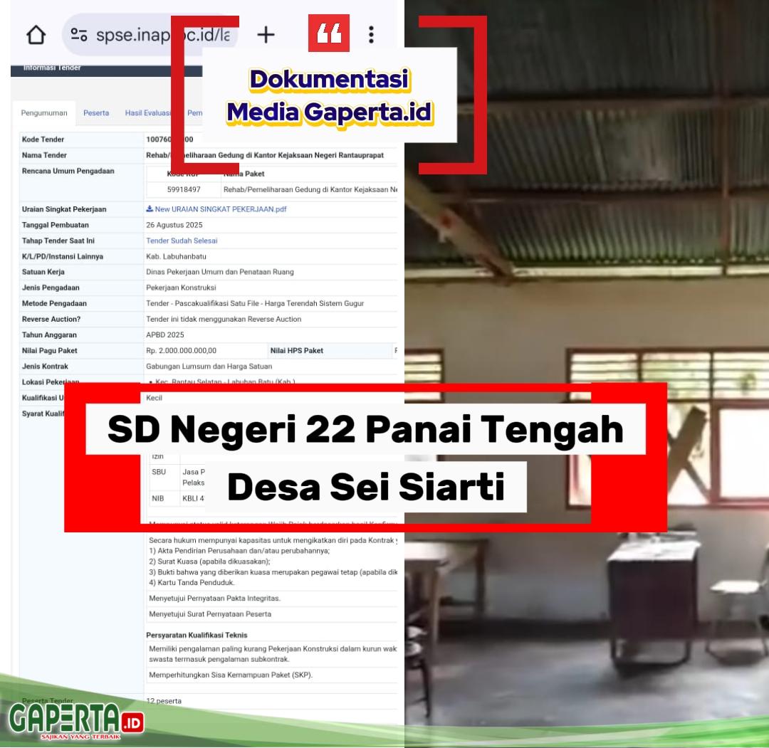 Labuhanbatu, [Gaperta.id] – Menyakitkan mata, Kontras tajam terlihat dalam alokasi anggaran pembangunan di Kabupaten Labuhan Batu, Sumatera Utara. Sementara SD Negeri 22 Panai Tengah di Desa Sei Siarti, Kecamatan Panai Tengah, Kabupaten Labuhan Batu terus mengalami kerusakan yang bertambah parah, dapat membahayakan keselamatan siswa dan guru dalam kegiatan belajar mengajar, kantor Kejaksaan Negeri ( Kejari ) Rantau Prapat tahun 2024 sudah mendapat dana hibah Rp 2 Miliar, kembali tahun 2025 ini mendapat dana hibah Rp 2 Miliar untuk Rehap/ Pemeliharaan Gedung di Kantor Kejaksaan Negeri Rantau Prapat dari APBD Pemda Labuhan Batu. Kode RUP : 59918497.