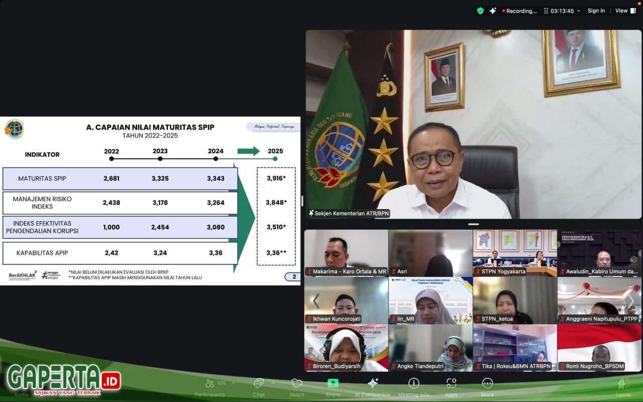 JAKARTA, [Gaperta.id] — Sekretaris Jenderal (Sekjen) Kementerian Agraria dan Tata Ruang/Badan Pertanahan Nasional (ATR/BPN), Pudji Prasetijanto Hadi mengingatkan jajaran akan pentingnya kolaborasi dalam pelaksanaan Sistem Pengendalian Intern Pemerintah (SPIP). Menurutnya, keberhasilan penerapan SPIP tidak dapat dicapai secara individual, melainkan membutuhkan sinergi dari seluruh unit kerja di lingkungan Kementerian ATR/BPN.