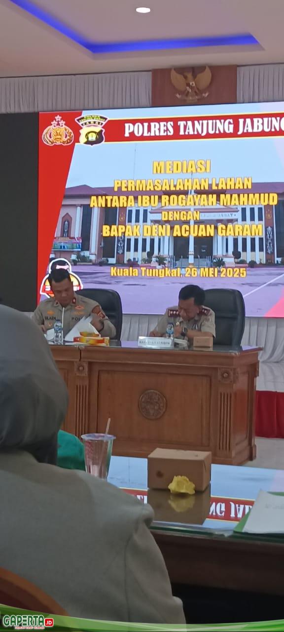 Tanjab Barat, [Gaperta.id] – Polres Tanjung Jabung Barat memfasilitasi mediasi sengketa lahan seluas ±310 hektar yang berlokasi di Desa Lumahan dan Desa Sungai Rambai, Kecamatan Senyerang, Kabupaten Tanjung Jabung Barat. Sengketa ini melibatkan dua pihak, yakni Ibu Rogayah Mahmud selaku pengelola lahan sejak lama, dan Bapak Deni Acuan Garam yang mengklaim kepemilikan atas lahan tersebut melalui transaksi dan izin resmi.