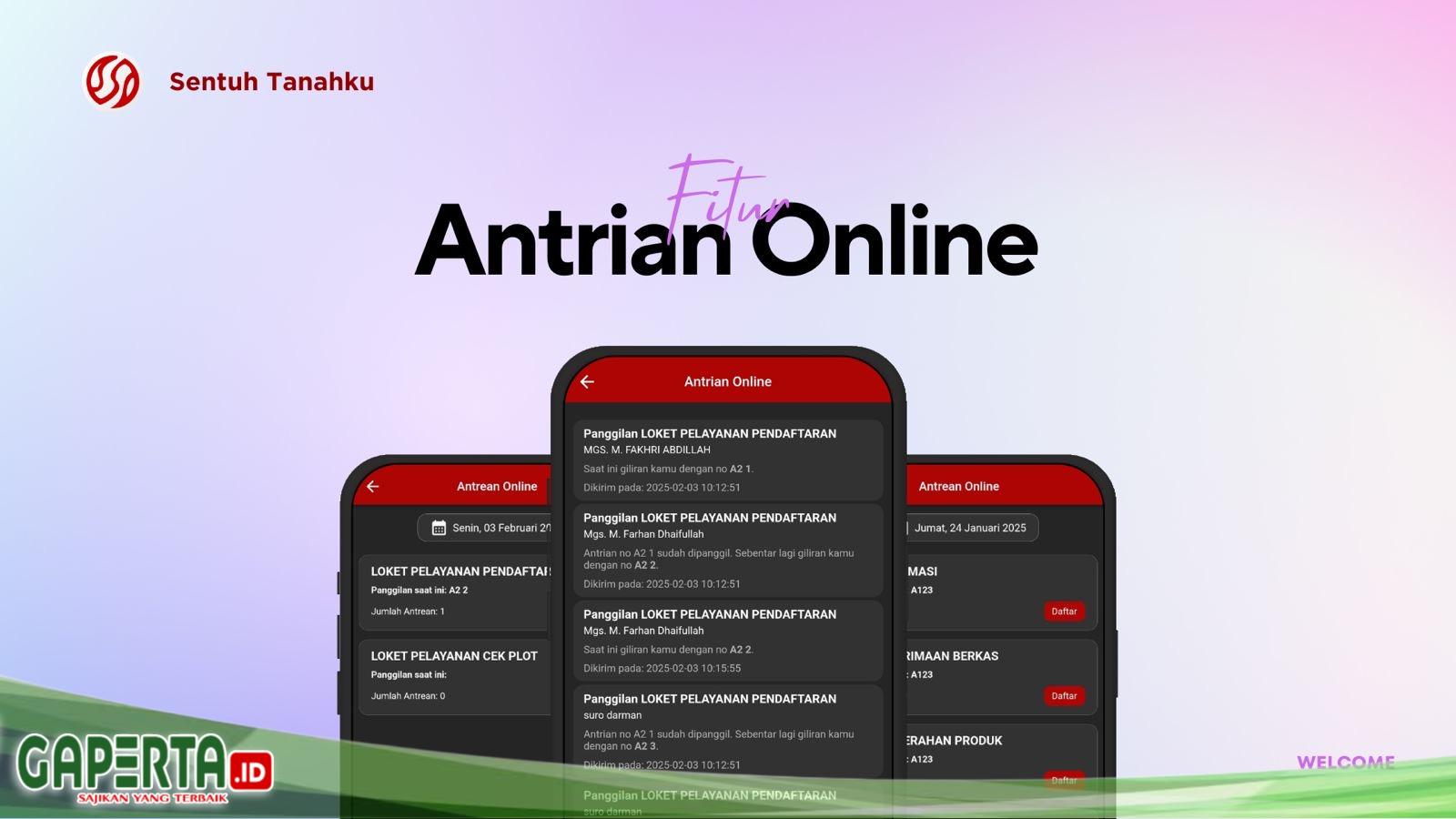 Untuk menjawab kebutuhan tersebut, Kementerian Agraria dan Tata Ruang/Badan Pertanahan Nasional (ATR/BPN) menghadirkan aplikasi Sentuh Tanahku. Dalam aplikasi ini, ada satu fitur yang bisa digunakan masyarakat untuk mengetahui nomor layanan sebelum nantinya menyambangi loket pelayanan di Kantah. Fitur itu disebut Antrian Online.