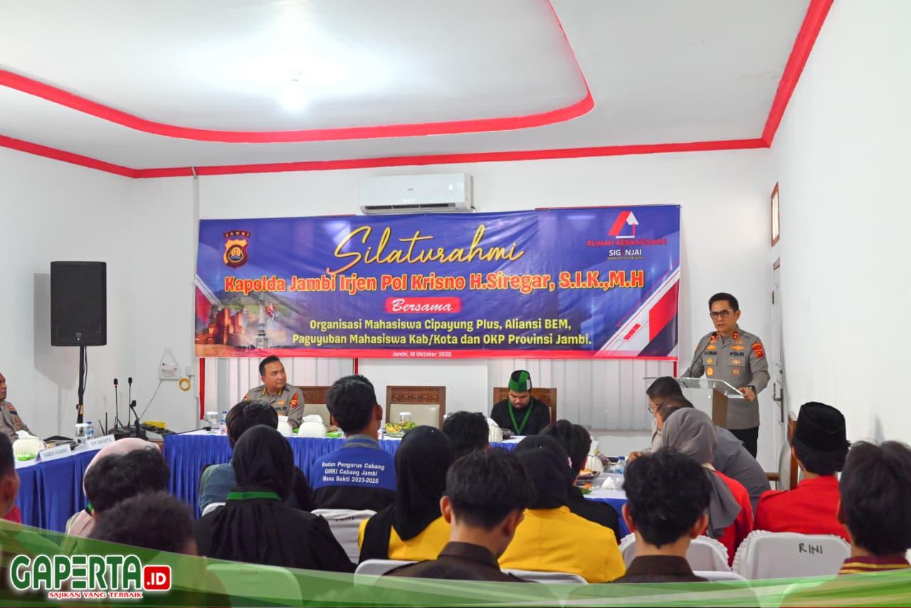 JAMBI, [Gaperta.id] – Kapolda Jambi Irjen Pol. Krisno H. Siregar, melaksanakan kegiatan Silaturahmi bersama Organisasi Mahasiswa Cipayung Plus, Aliansi BEM, Paguyuban Mahasiswa Kabupaten/Kota, dan OKP Provinsi Jambi di Rumah Kebangsaan Siginjai, Kamis (16/10/2025).