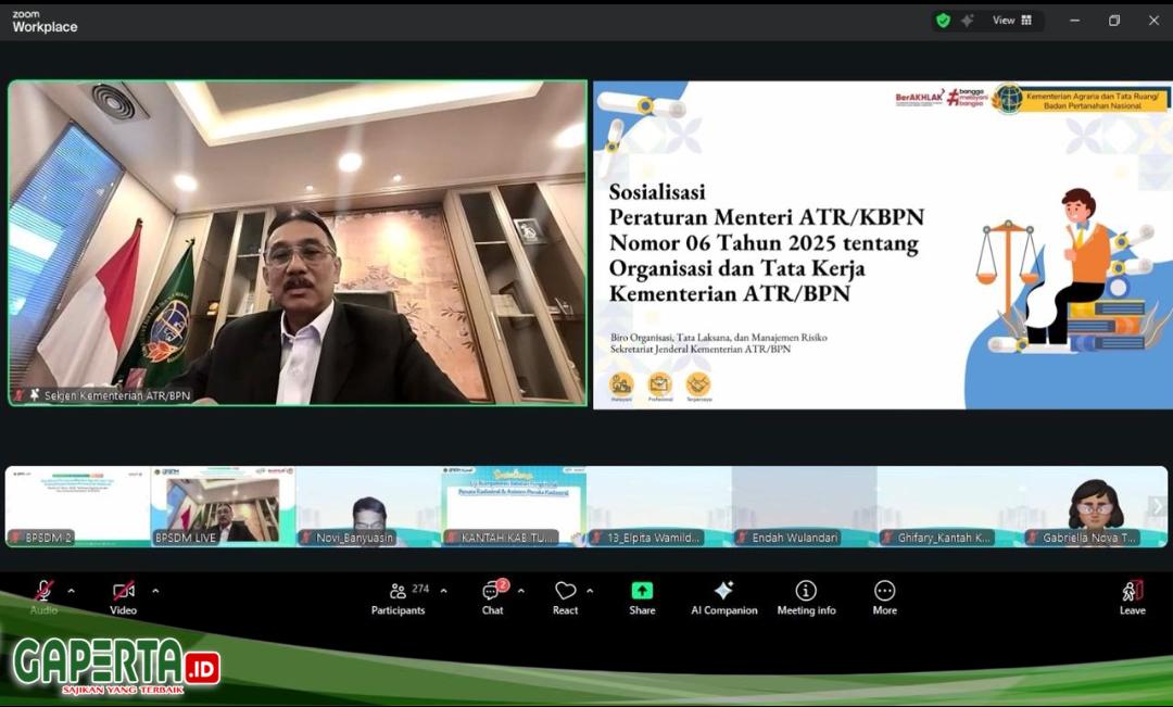 JAKARTA, [Gaperta.id] – Sekretaris Jenderal (Sekjen) Kementerian Agraria dan Tata Ruang/Badan Pertanahan Nasional (ATR/BPN), Dalu Agung Darmawan, menegaskan empat pesan bagi jajaran pusat dan daerah dalam Webinar Nasional Sosialisasi Peraturan Menteri ATR/Kepala BPN Nomor 6 Tahun 2025 tentang Organisasi dan Tata Kerja Kementerian ATR/BPN, yang berlangsung pada Kamis (12/03/2026). Pesan tersebut mencakup pemahaman mendalam terhadap regulasi, penyesuaian pelaksanaan tugas dan fungsi, penguatan koordinasi antar unit kerja, serta pemanfaatan regulasi sebagai pedoman peningkatan kualitas layanan pertanahan.