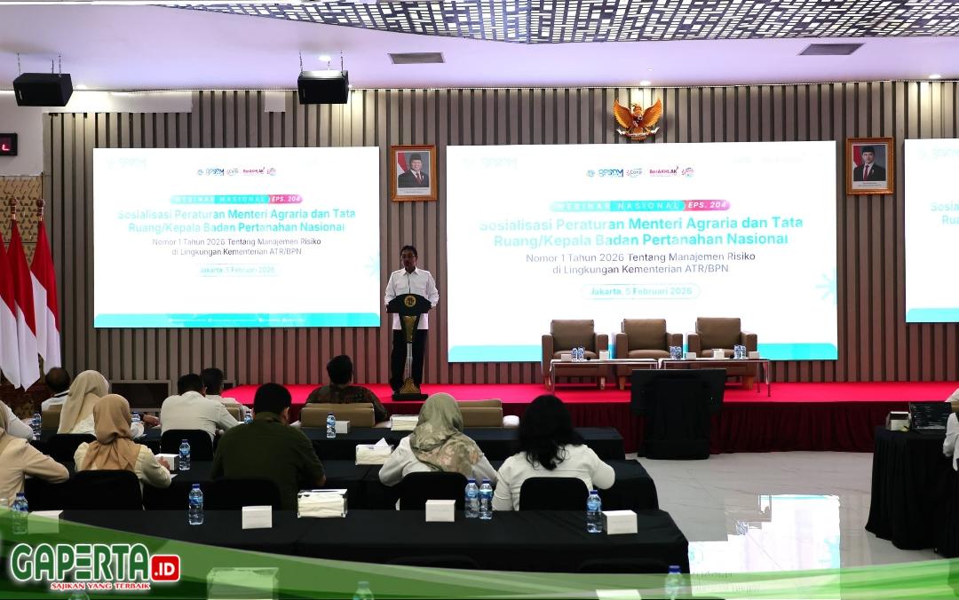 JAKARTA, [Gaperta.id] – Kementerian Agraria dan Tata Ruang/Badan Pertanahan Nasional (ATR/BPN) memperkuat penerapan manajemen risiko dalam meningkatkan kualitas pelayanan publik melalui terbitnya Peraturan Menteri (Permen) ATR/Kepala BPN Nomor 1 Tahun 2026 tentang Manajemen Risiko. Peraturan tersebut menjadi fondasi tata kelola organisasi yang terintegrasi, sistematis, dan berkelanjutan. Untuk meningkatkan pemahaman jajaran terhadap kebijakan tersebut, Kementerian ATR/BPN menggelar Webinar Sosialisasi Permen ATR/Kepala BPN 1/2026 tentang Manajemen Risiko, secara daring dan luring di Aula Prona, Jakarta, Kamis (05/02/2026).