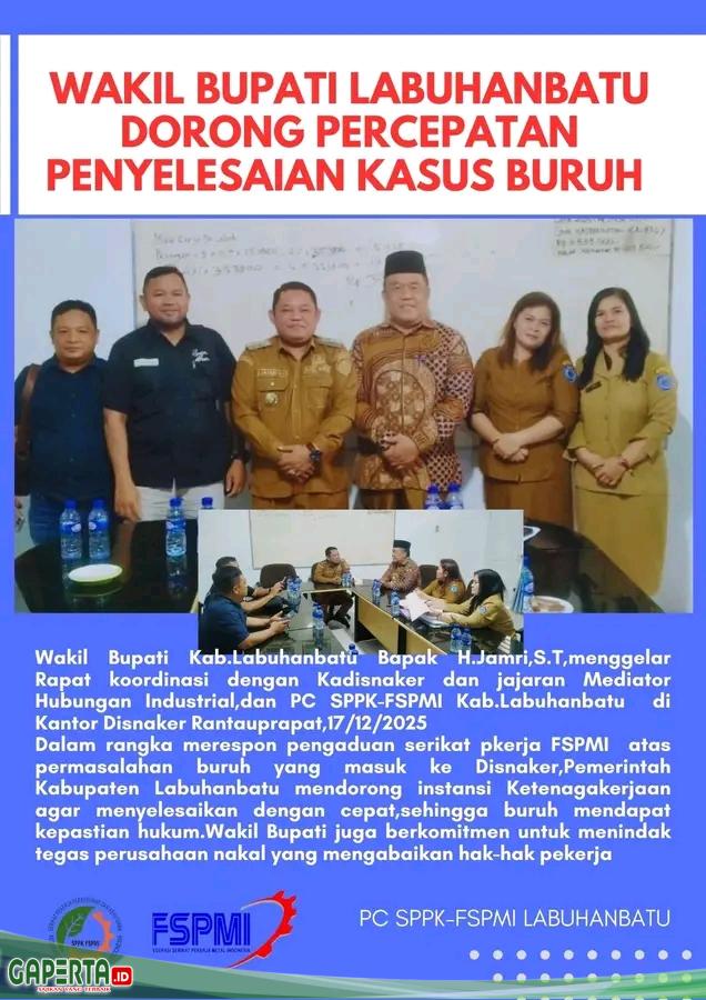 Dalam rangka merespon pengaduan serikat pekerja FSPMI atas permasalahan buruh yang masuk ke Disnaker,Pemerintah kabupaten Labuhanbatu mendorong instansi ketenagakerjaan agar dapat menyelesaikan dengan cepat,sehingga buruh mendapat kepastian hukum.Wakil Bupati juga berkomitmen untuk menindak tegas perusahaan nakal yang mengabaikan hak-hak pekerja